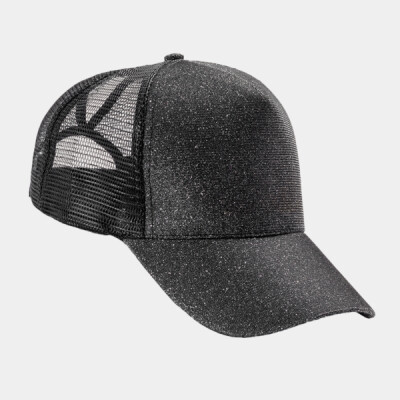 5-panel cap (4 mesh/1 fabric). Sparkle fabric stiffened front panel and peak. Mesh back with ponytail hole. Tear-release adjuster. Semi-curved fabric peak made from recycled plastic. Tear-away label.
